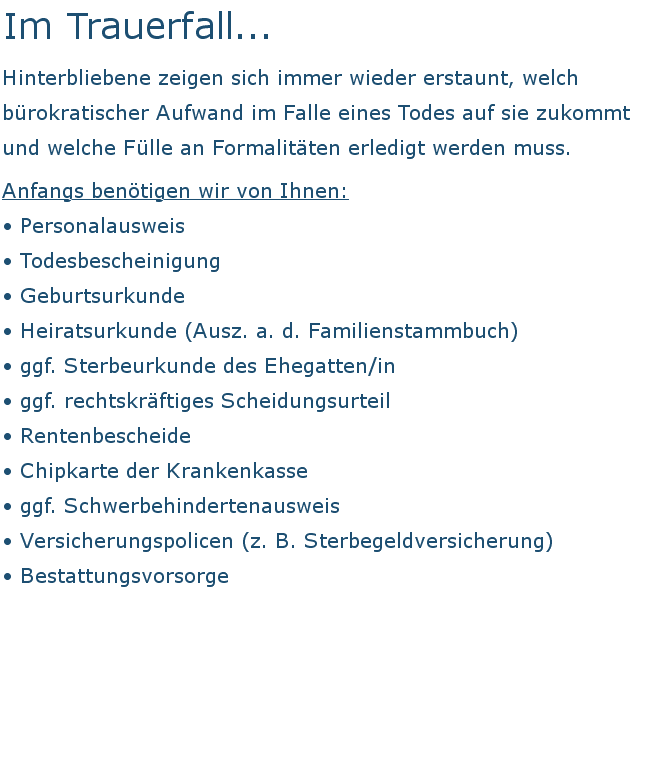 Im Trauerfall... Hinterbliebene zeigen sich immer wieder erstaunt, welch bürokratischer Aufwand im Falle eines Todes auf sie zukommt und welche Fülle an Formalitäten erledigt werden muss. Anfangs benötigen wir von Ihnen: • Personalausweis • Todesbescheinigung • Geburtsurkunde • Heiratsurkunde (Ausz. a. d. Familienstammbuch) • ggf. Sterbeurkunde des Ehegatten/in • ggf. rechtskräftiges Scheidungsurteil • Rentenbescheide • Chipkarte der Krankenkasse • ggf. Schwerbehindertenausweis • Versicherungspolicen (z. B. Sterbegeldversicherung) • Bestattungsvorsorge