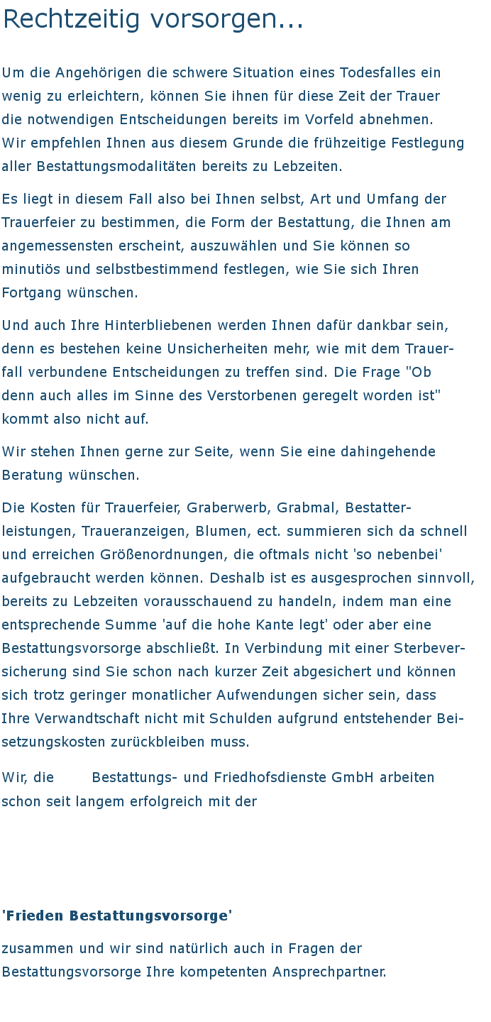 Rechtzeitig vorsorgen... Um die Angehörigen die schwere Situation eines Todesfalles ein wenig zu erleichtern, können Sie ihnen für diese Zeit der Trauer die notwendigen Entscheidungen bereits im Vorfeld abnehmen. Wir empfehlen Ihnen aus diesem Grunde die frühzeitige Festlegung aller Bestattungsmodalitäten bereits zu Lebzeiten. Es liegt in diesem Fall also bei Ihnen selbst, Art und Umfang der Trauerfeier zu bestimmen, die Form der Bestattung, die Ihnen am angemessensten erscheint, auszuwählen und Sie können so minutiös und selbstbestimmend festlegen, wie Sie sich Ihren Fortgang wünschen. Und auch Ihre Hinterbliebenen werden Ihnen dafür dankbar sein, denn es bestehen keine Unsicherheiten mehr, wie mit dem Trauer- fall verbundene Entscheidungen zu treffen sind. Die Frage "Ob denn auch alles im Sinne des Verstorbenen geregelt worden ist" kommt also nicht auf. Wir stehen Ihnen gerne zur Seite, wenn Sie eine dahingehende Beratung wünschen. Die Kosten für Trauerfeier, Graberwerb, Grabmal, Bestatter- leistungen, Traueranzeigen, Blumen, ect. summieren sich da schnell und erreichen Größenordnungen, die oftmals nicht 'so nebenbei' aufgebraucht werden können. Deshalb ist es ausgesprochen sinnvoll, bereits zu Lebzeiten vorausschauend zu handeln, indem man eine entsprechende Summe 'auf die hohe Kante legt' oder aber eine Bestattungsvorsorge abschließt. In Verbindung mit einer Sterbever- sicherung sind Sie schon nach kurzer Zeit abgesichert und können sich trotz geringer monatlicher Aufwendungen sicher sein, dass Ihre Verwandtschaft nicht mit Schulden aufgrund entstehender Bei- setzungskosten zurückbleiben muss. Wir, die LK Bestattungs- und Friedhofsdienste GmbH arbeiten schon seit langem erfolgreich mit der 'Frieden Bestattungsvorsorge' zusammen und wir sind natürlich auch in Fragen der Bestattungsvorsorge Ihre kompetenten Ansprechpartner.